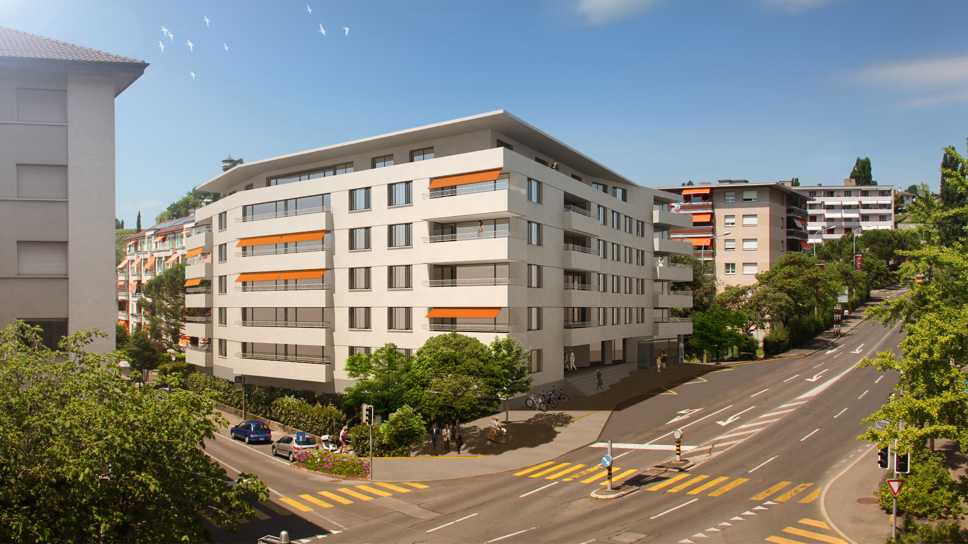 Projet d’un immeuble locatif articulé sur la parcelle afin d’offrir aux 52 appartements à louer un maximum de lumière et de dégagement tout en restant conforme à la pratique communale.